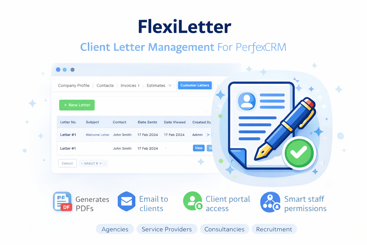 FlexiLetter is a powerful module designed for Perfex CRM that allows businesses to create, manage, and send professional client letters directly from their CRM system. Generate beautifully formatted PDFs, track engagement, and streamline communication — all in one place.